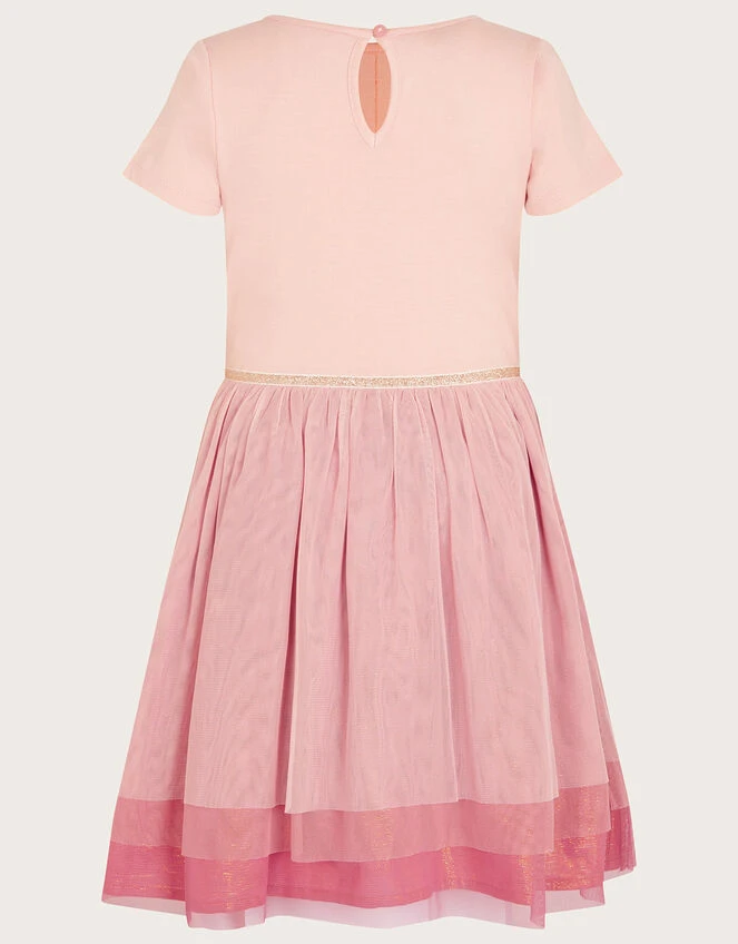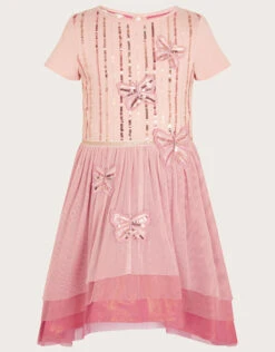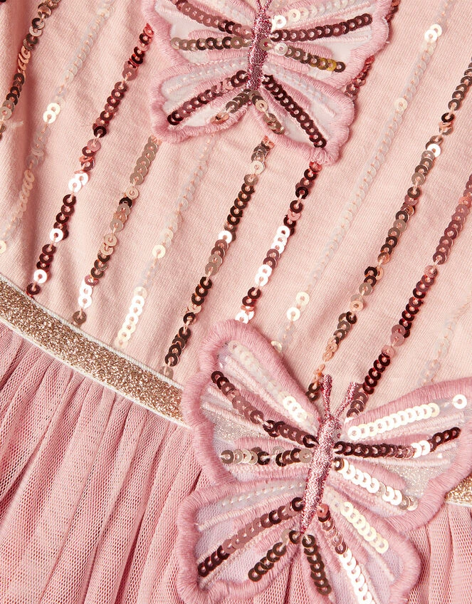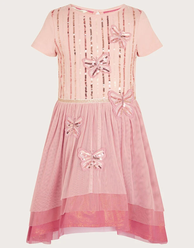Cast in a balletic pink palette, this dress was simply made for dancing. To the t-shirt bodice sparkle rows of sequins, falling into a layered tulle skirt that houses a kaleidoscope of butterflies.