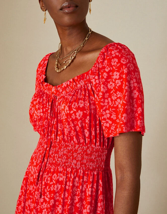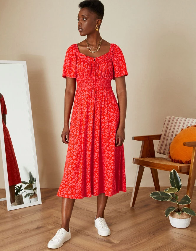 Inspired by the colours of Valentines: a pretty pairing of red and pink spills through the florals on this dress. Its frill neckline and puff sleeves add a feminine edge to the bodice, with a shirred waist that brings attention to the airy midi skirt. Spun in lightweight LENZING™ ECOVERO™.