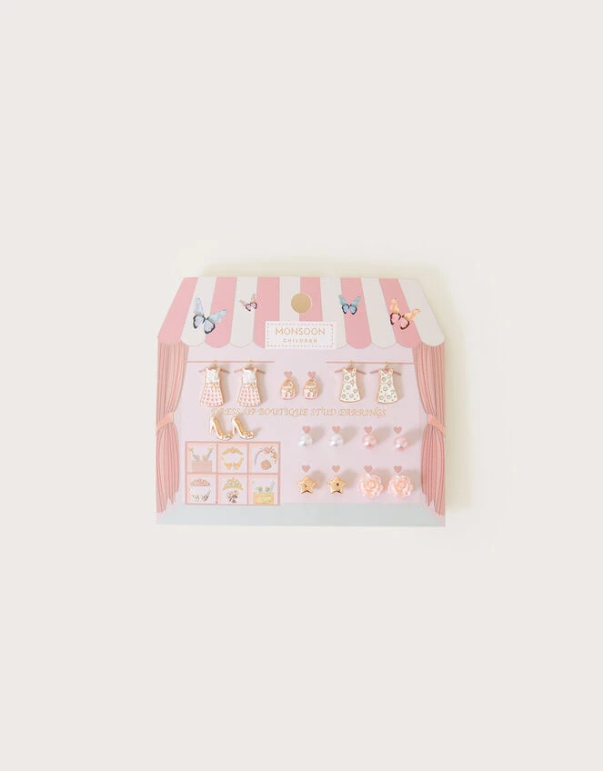 Comprised of pearls, stars, and flower studs, this earring set boasts the sweetest dress up designs, featuring dress, bags, and shoes. Eight pairs included.