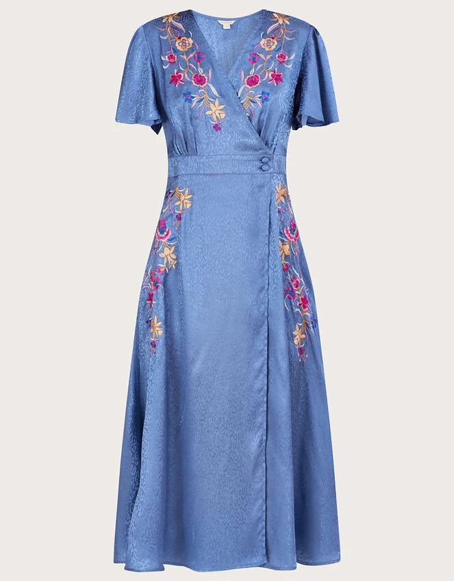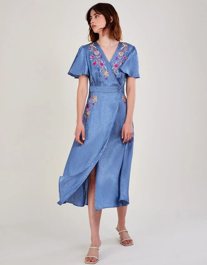 Ooze elegance with Elizabeth, designed in a shiny jacquard fabric. She’s finished in a classic wrap style, with a sweet button fastening and pretty flutter sleeves. Her floral embroidery travels down the neckline and to the sides of the skirt, adding length to the profile. Simply pair her with a simple strappy heel for smart casual occasions. Blue