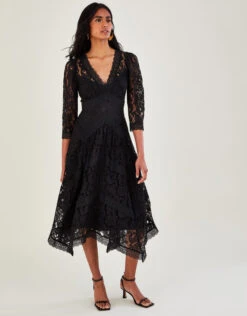 MONSOON Ellen Lace Hanky Hem Dress Black