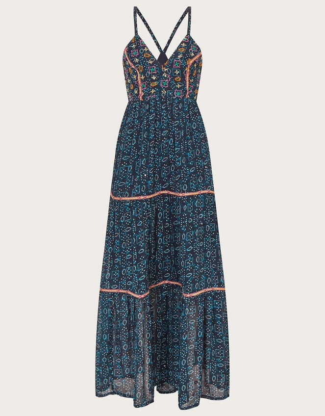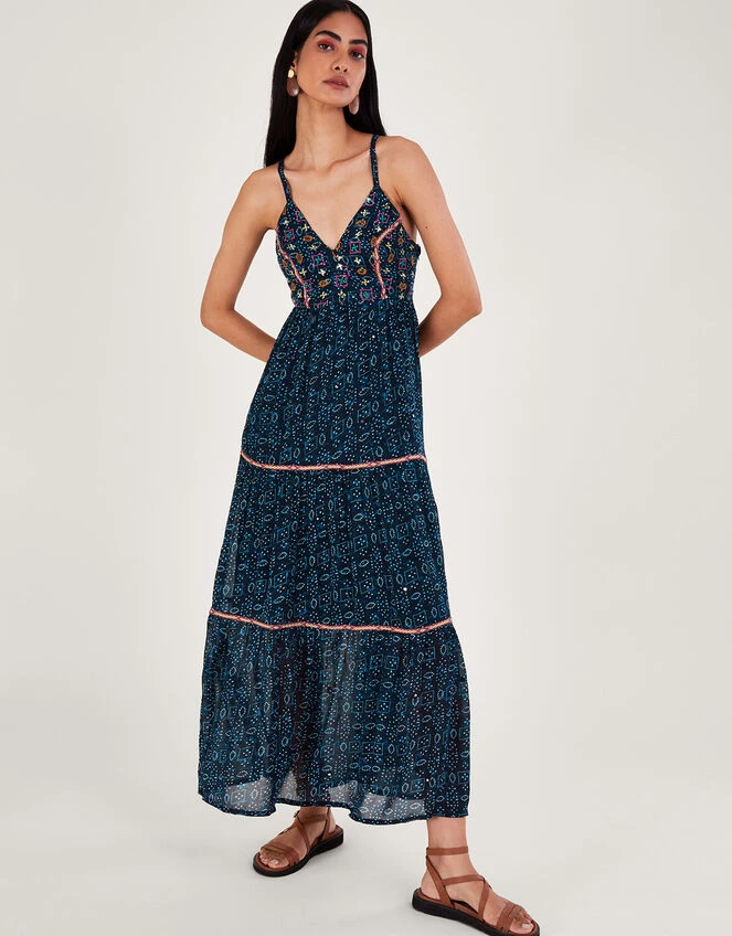 This simple cami silhouette is made for long, lustrous summer walks. The bodice is designed with fine shoulder straps, a v-neckline, and vibrant embroidery that shines atop the print backdrop. Featuring a tiered finish and sheer overlay, the skirt falls to a midi length that’ll dance around amongst the breeze.