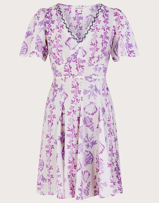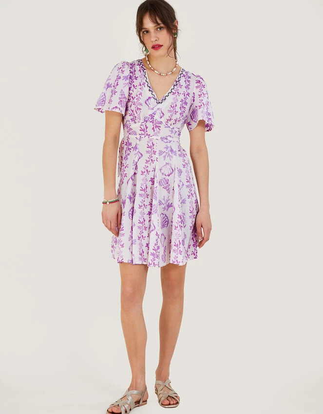 In violet painterly fashion, shells and botanicals decorate throughout this shorter length dress. Beautifully feminine and just as flattering, the profile is pinched at the waist with corset-inspired seams whilst the skirt flares out into an A-line cut. Want to accessorise? Decorate the embellished v-neckline with a single pendant necklace or go statement with a beaded collar chain.