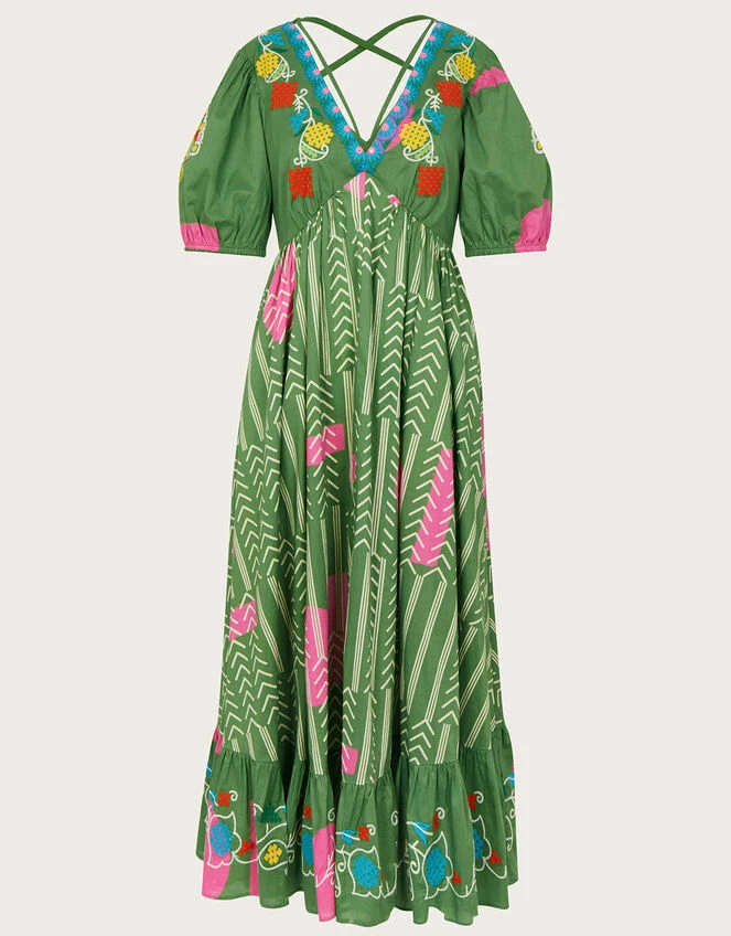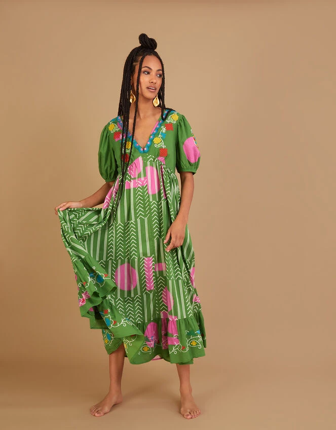 Follow the journey of Ahir embroidery, hand-printing and vibrant colours on this dress, creating a piece that’s full of life. The silhouette includes a short bodice that’s defined at the empire line with puff sleeves and a tie v-neck, whilst the skirt billows below to midi length with a tiered hem. Rest assured you’ll look just as good from the back thanks to the crossover tie detail and statement tassel.