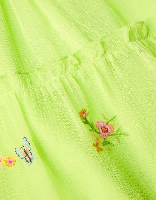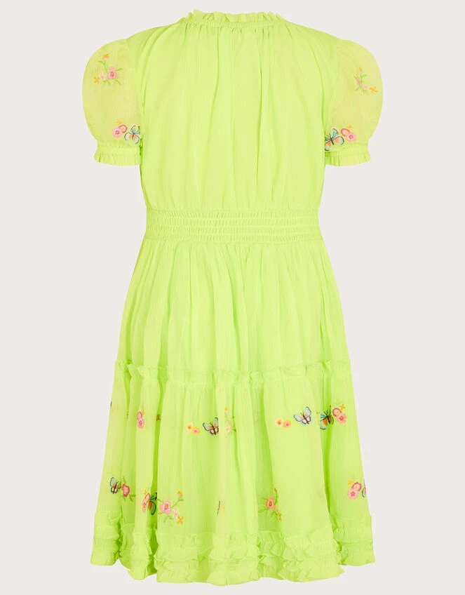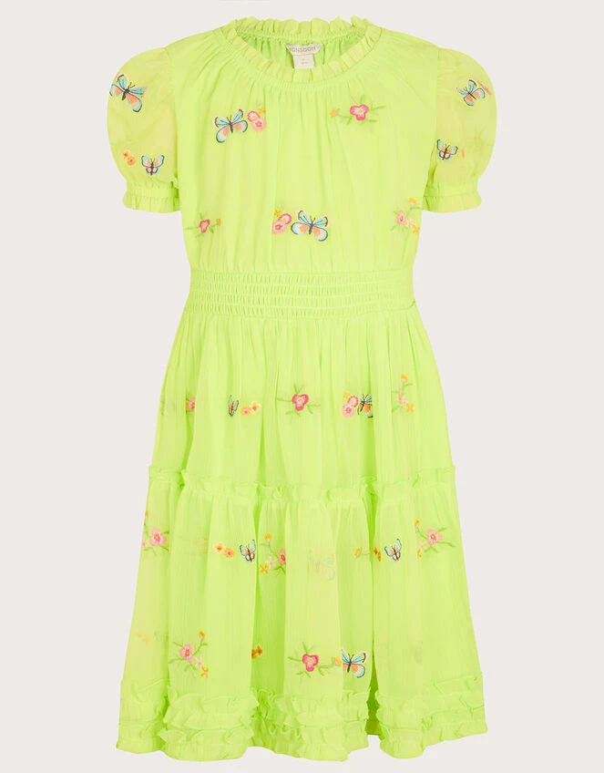 Nature’s in full force with this dress, scattered with a kaleidoscope of butterflies on a vibrant lime backdrop. It’s super comfy, with a shirred waist and flowy skirt. The ruffle detailing on the neckline, skirt, and puff sleeves add a pretty finish, perfect for summer partying.