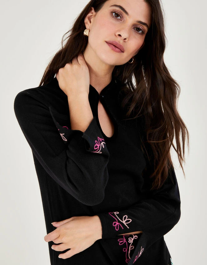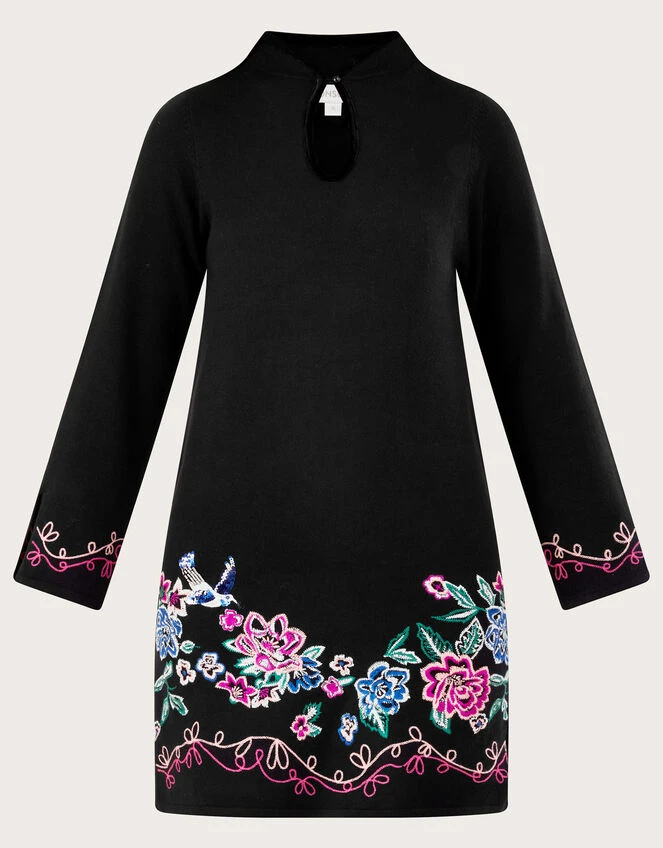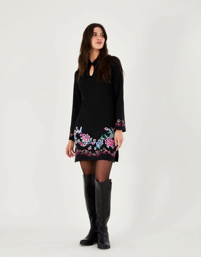 Take it back to the swinging 60s with this tunic dress, perfect for parties and dinner dates. It features a mandarin-inspired collar with keyhole detailing for a chic touch, with bright floral embroidery to the hem and sleeves that pops against the black backdrop.