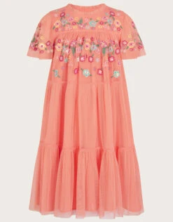 Perfectly paired with a sunny backdrop, this floaty dress is designed with a lighter-than-air tulle overlay for warm summer afternoons. The ruffle neckline and angel sleeves add a pretty finish, whilst the bodice is embroidered with a bouquet of mini florals. Fastens with a button on the reverse.