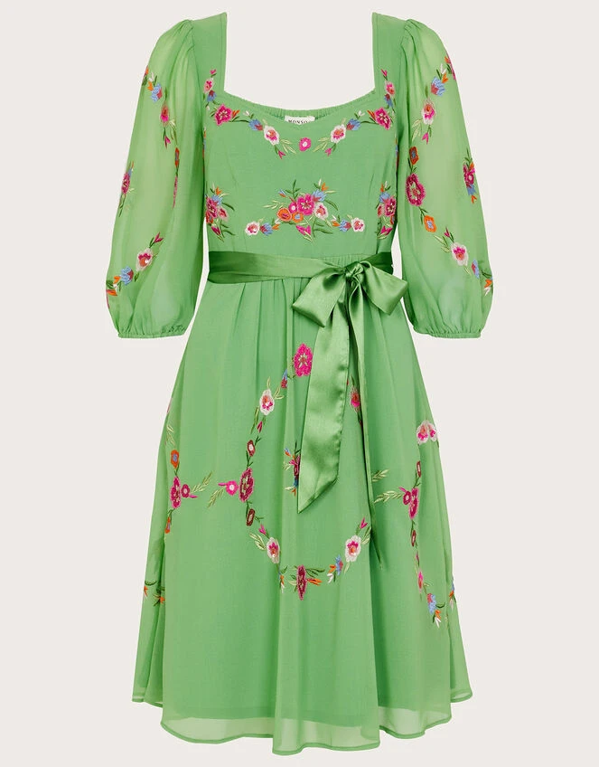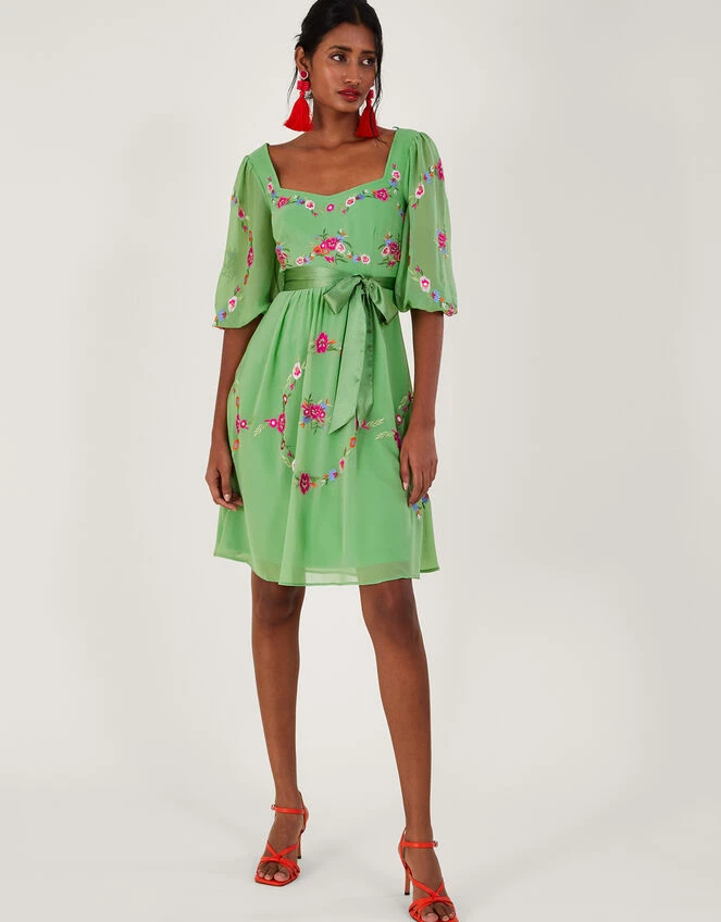 Boasting embroidered florals that bloom on a refreshing apple green backdrop, this dress is ideal for summertime partying. The sweetheart neckline and billowy sleeves add a feminine finish, all tied up with a sleek satin bow to the waist.