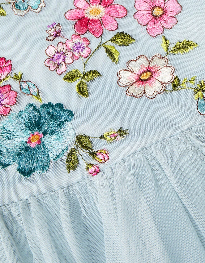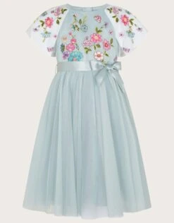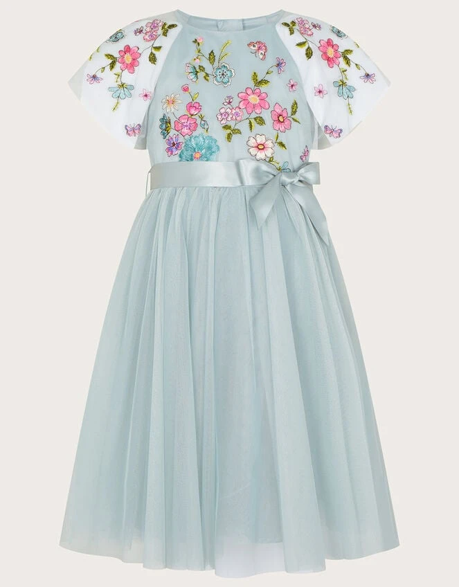 Blooming with embroidered florals for their first round of summer celebrations, this dress features a super floaty and comfortable cape sleeve, allowing room for plenty of dancing. To the waist is a sleek satin bow, with a tulle skirt and zip fastening on the reverse. Green