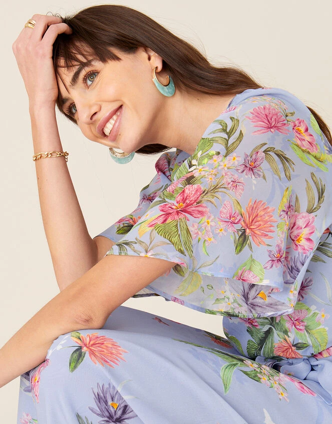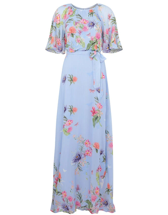 A dream for the summer, our Esmee gown combines calming lilac chiffon with a print of garden florals. Flutter sleeves add to the femininity of the piece, whilst the matching belt will draw you in at the waist, creating a subtle hourglass silhouette. Blue