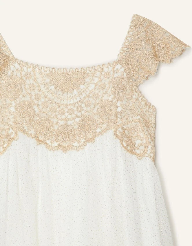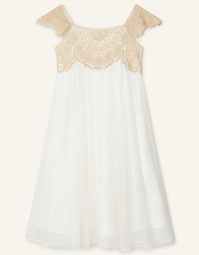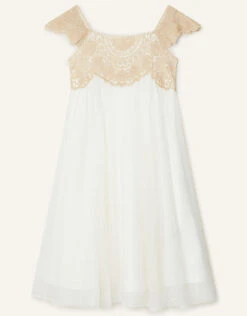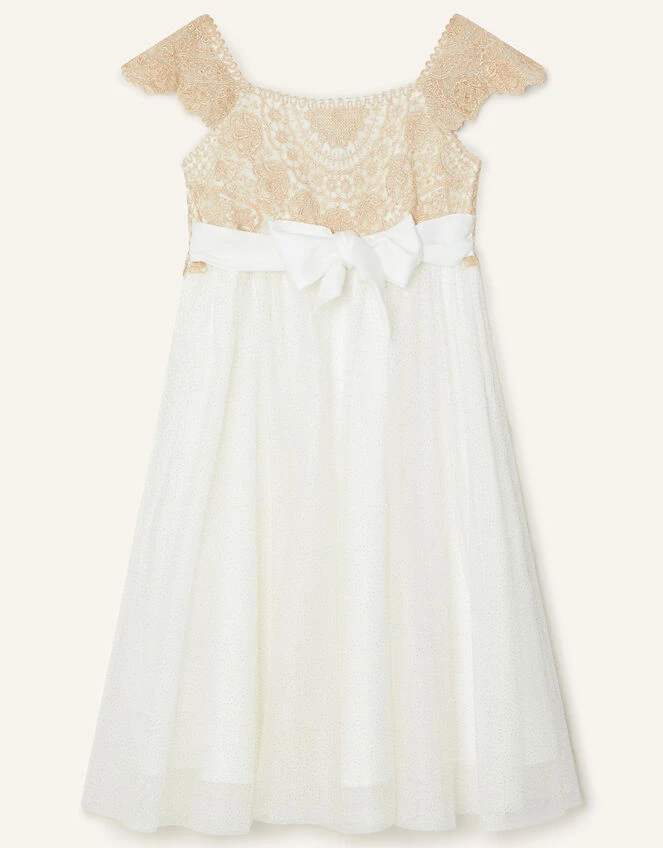 Worthy of those super-special occasions, our Estella dress for girls sparkles and shines with a magical quality. The bodice is created in shimmery lace and the skirt boasts layers of glitter mesh. To finish, a pretty satin sash ties at the back. Fully lined. Gold