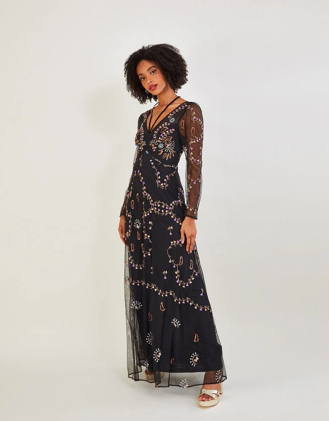Impeccably embroidered, the detail on our Evangelina dress makes her a stand-out piece at special occasions. Through the light overlay of mesh, you’ll find pastel florals twist and turn throughout the delicate silhouette, with embellishments to enhance the design even further. It sits fitted through the long sleeve bodice and flares gently to maxi length, with a tie detail around the neck.