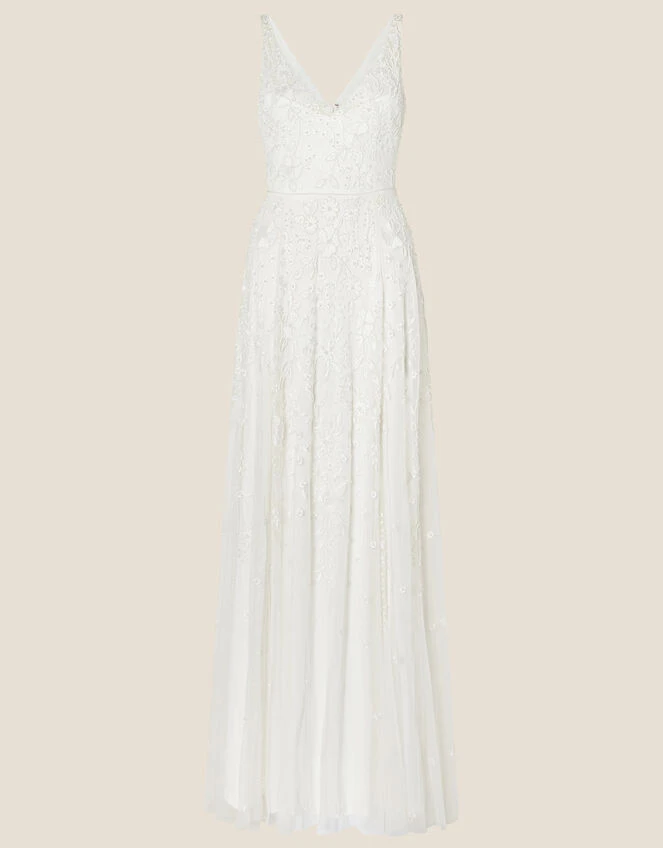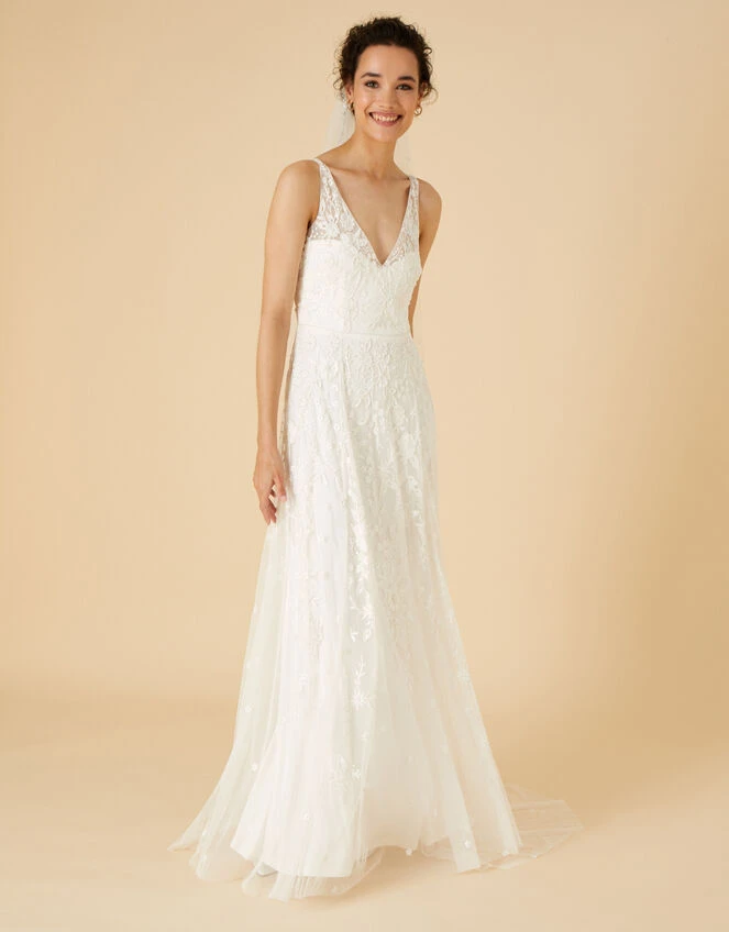 Fresh and floaty, our Eve bridal dress is adorned with delicate embellishments, making your special day even more perfect. The beautiful yet subtle flare on her skirt should skim the floor as you glide down the aisle, and can be altered by a seamstress for the perfect length.