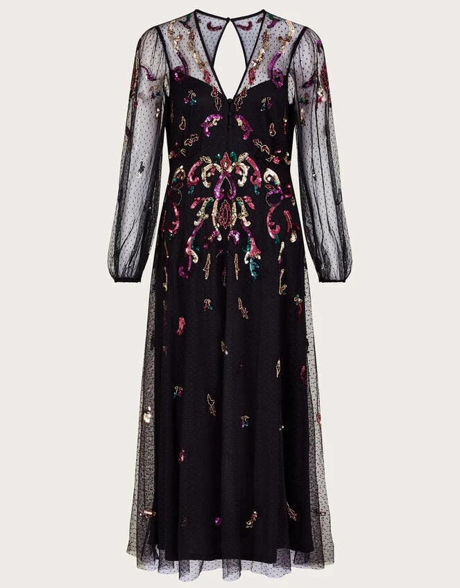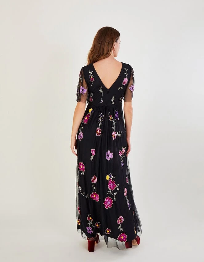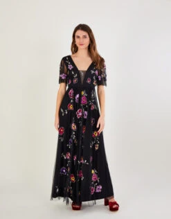 Ensuring she’s seen, Faye’s embellishments are bursting with yellow, pink and purple sequins over the black mesh overlay. Falling floatily down into a maxi length, the profile is built with wispy sleeves and a v-neck through the bodice; sitting pinched at the empire line and cascading into an A-line skirt.
