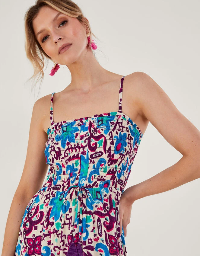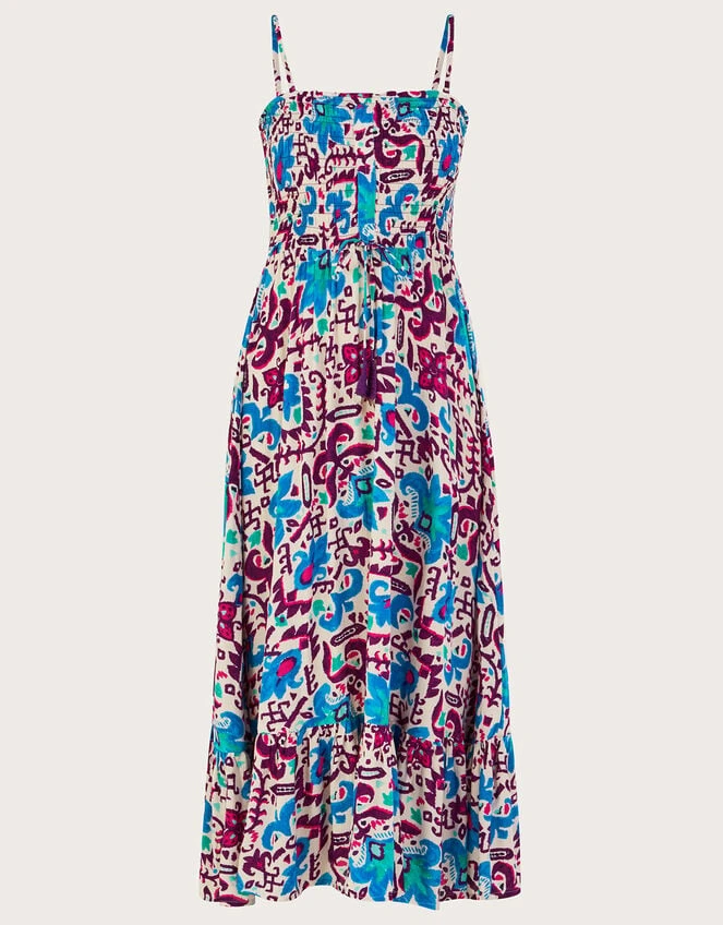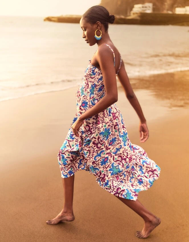Immersed in bright and beautiful florals, this cami dress is suitably lightweight for coastal escapes. Shirring lends the bodice texture and stretchiness, before the rest of the piece falls to midi length with a tiered hem.