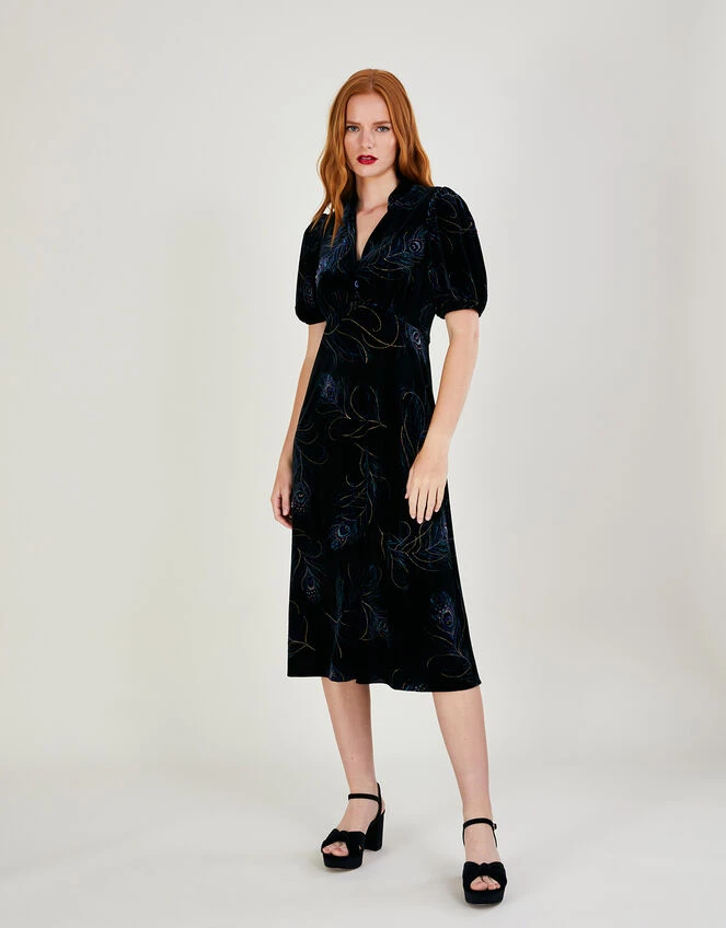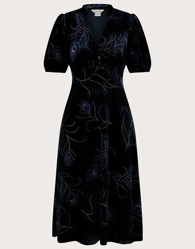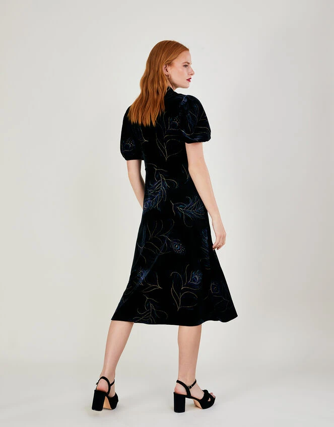 MONSOON Fleur Feather Print Velvet Midi Dress Black