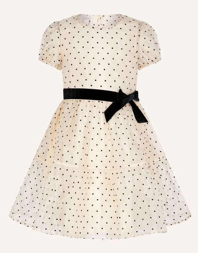 A sheer mesh overlay and bow detail make this dress party-perfect. With a monochrome pallet, this dress is ideal for weddings and christenings. Style it with a sweet hair-bow and their favourite shoes. Ivory