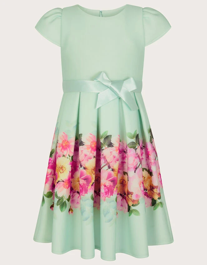 Pretty florals grace the skirt on this sweet dress, perfect for little wedding guests or more casual bridesmaids. The bodice boasts a snug fit, with sweet capped sleeves, falling into a box pleated skirt and sleek satin bow to the waist. Green