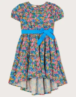 Colourful florals decorate this dress, ready for spring to blossom. Full of pretty detailing, this dress features a ruffle neckline, slightly puff sleeves, and a dipped hemline on a tiered skirt. And for a final touch, it’s all tied up nicely with a sleek satin bow to the waist!
