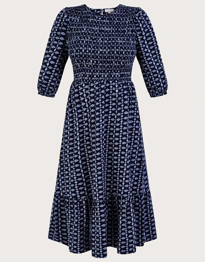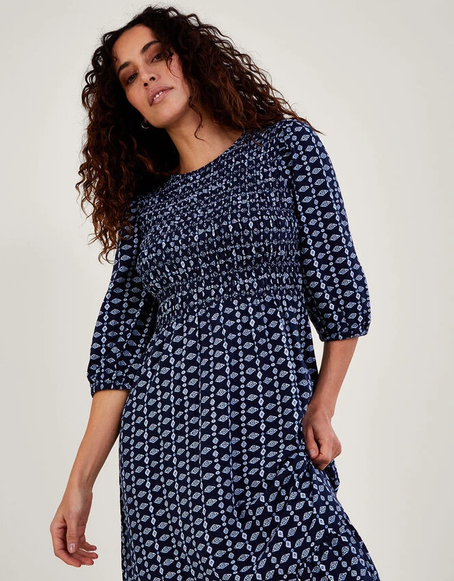 It’s all down to the details on this dress, featuring a stretchy shirred bodice; airy 3/4 length sleeves and a tiered hem to the midi skirt. Doused in a bohemian geometric print, style it alongside tan leather boots for a warm finish.