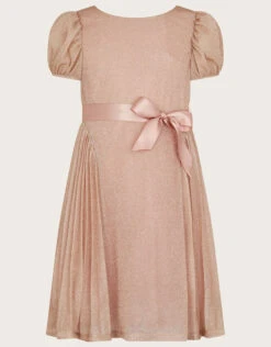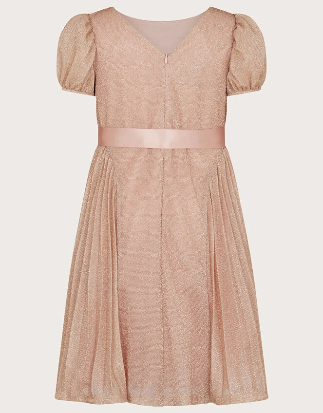 Sparkling just like a disco ball, this party dress is designed with a rose gold backdrop and super glittery overlay. The puff sleeves and pleated panels make for a pretty finish, securing round the waist with a sleek satin bow. Pink
