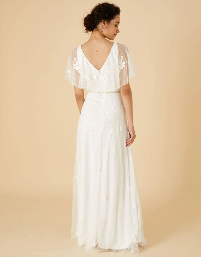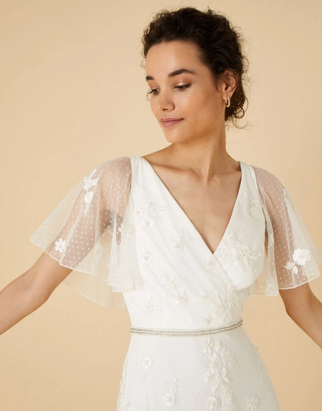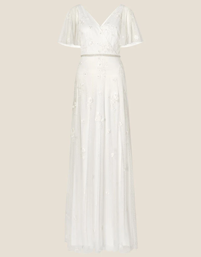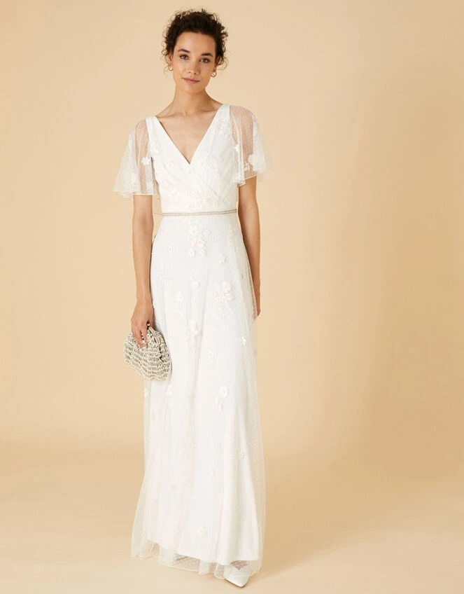 Soft silhouettes are a bridal favourite of ours at Monsoon. Gillian promotes a wrap-style bodice, sheer flutter sleeves and a softly-flared maxi skirt, overlaid throughout with finely spotted mesh and beaded embellishments. The champagne-tone beading brings attention to the cinched waist with a concealed zip on the reverse to fasten.