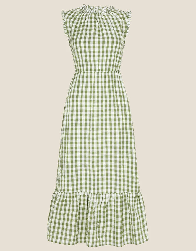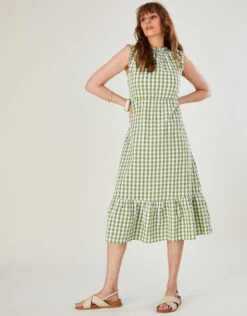 This dress features pretty ruffle detailing to the neck and sleeves, finished with a tiered midi length skirt. Simply pair it with your favourite white trainers for a sunny daytime look. Green