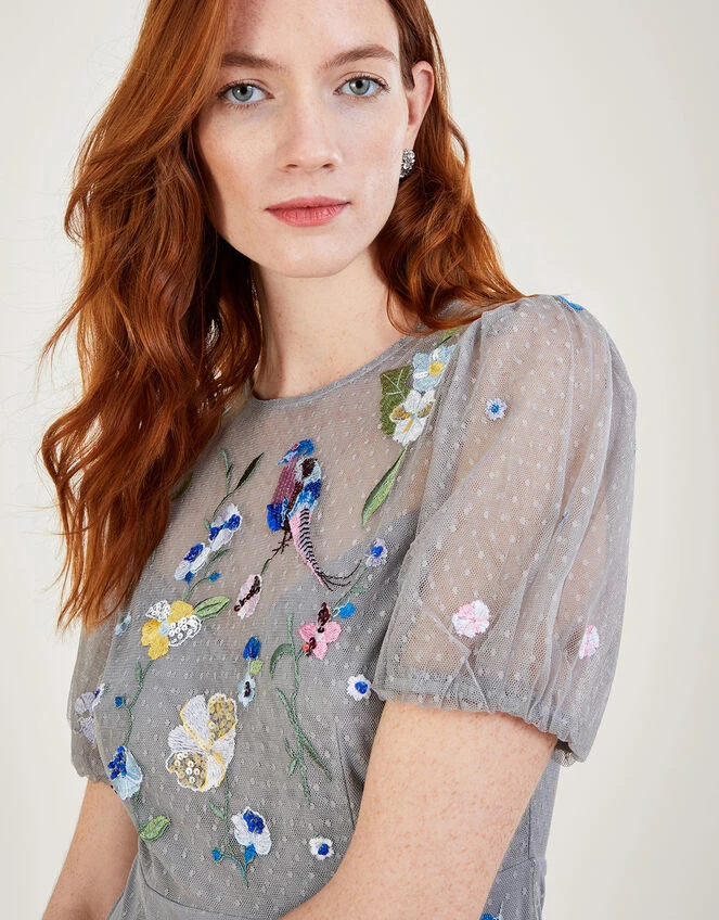 MONSOON Gwendolyn Embroidered Tiered Midi Dress Grey