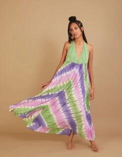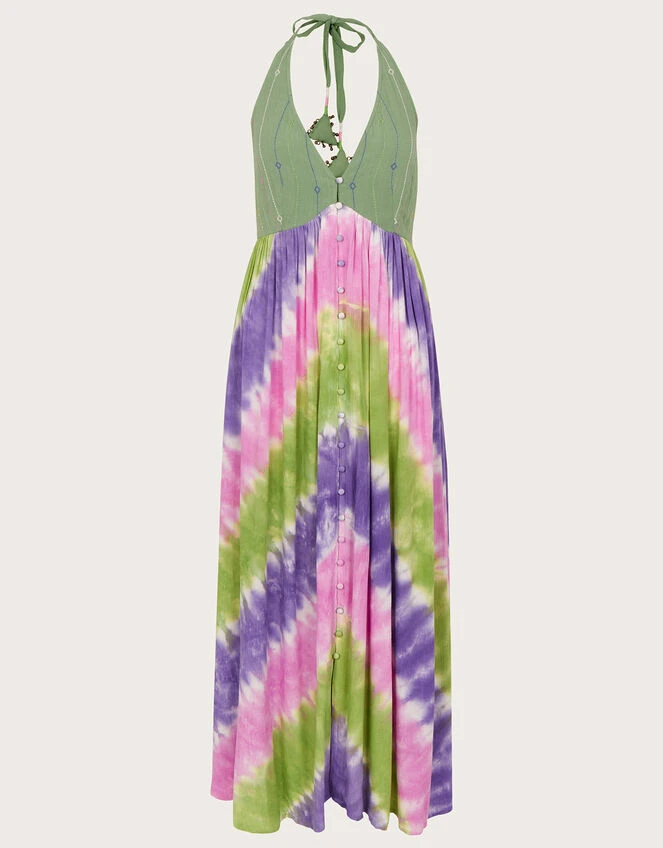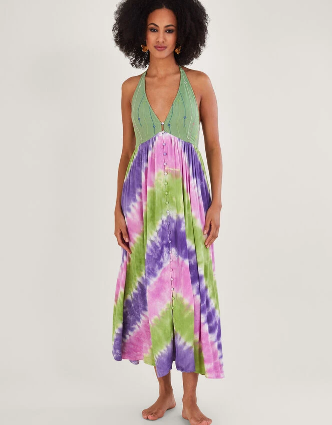 From dreamy sage fabric into hypnotic tie dye, this dress will dance in the summer breeze. Built with a halter neck, the bodice is touched with running Rabari embroidery for extra detail. Follow the button-through front down into the floaty skirt, falling to a midi length that pairs beautifully with strappy sandals.