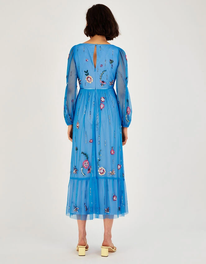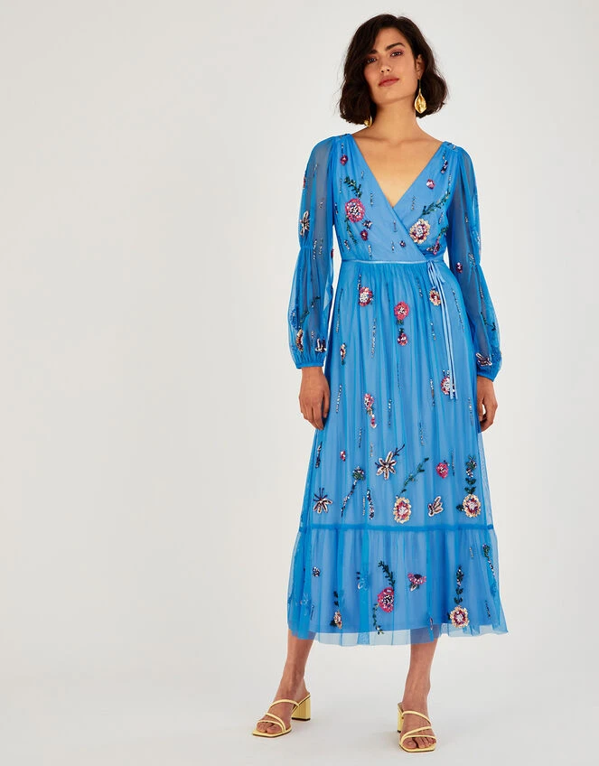 Finished in a timeless wrap silhouette, Hattie is your new go-to for smart casual occasions. Falling into a flowing midi-skirt, she features a gauzy mesh overlay with glistening floral embellishments all over for an ethereal touch. Style Hattie with a pair of vibrant strappy heels and you’re good to dance the night away! Blue