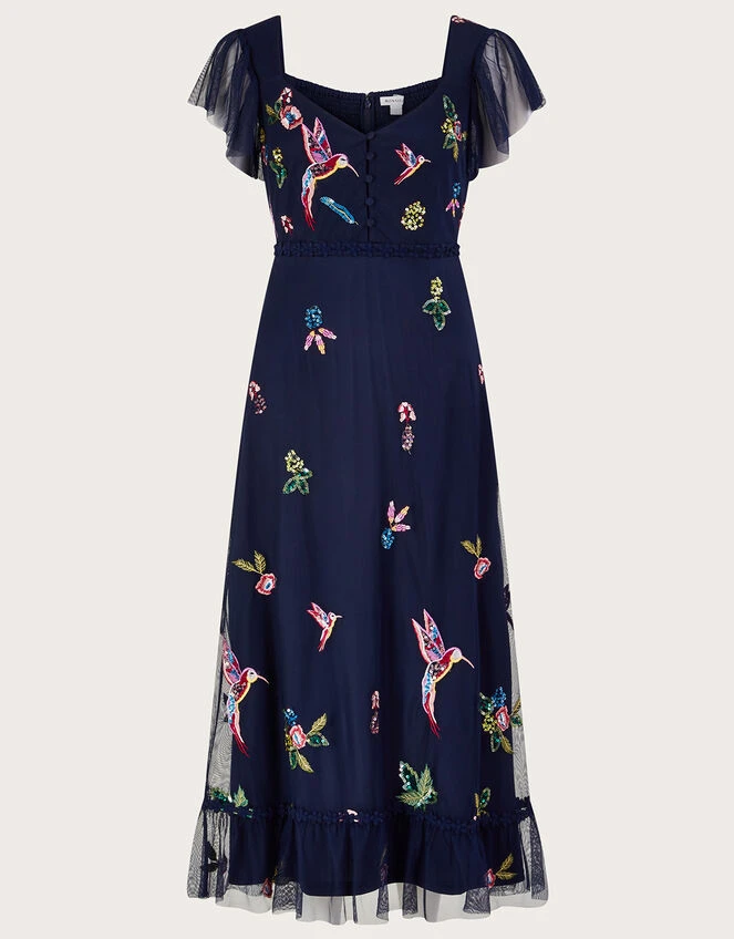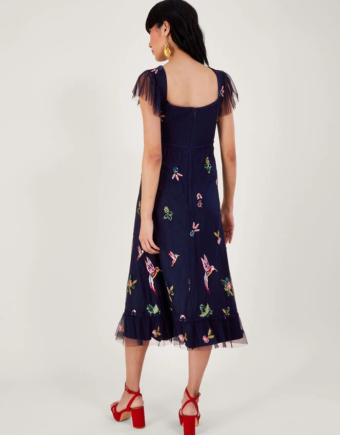 Bring a shimmering look to your next occasion with this embellished tea dress. This elegant midi-length design effortlessly creates a feminine silhouette and is cut to a regular fit. The bodice features sheer flutter sleeves and a sweetheart neckline complete with vintage-inspired button detailing.