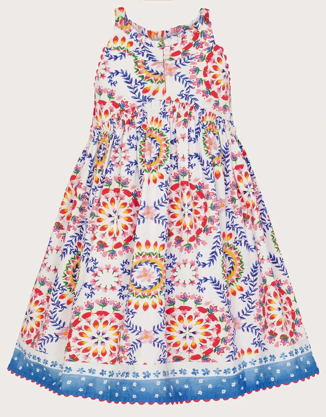 Splashed in a hypnotic floral print with blue vinery details…you can’t blame us when we say we just can’t get enough of this dress! Crocheted around the neckline in a primary palette, it features a sleeveless bodice that floats down into a flared skirt, finished with scallop trims. Engineered in better-sourced cotton with a recycled polyester lining.