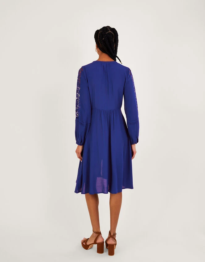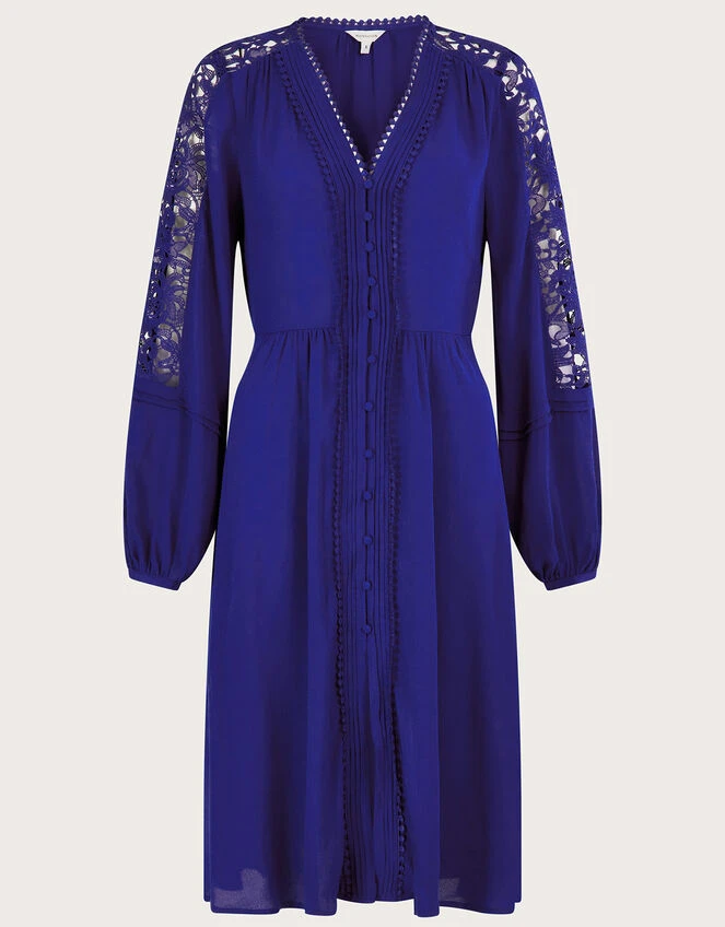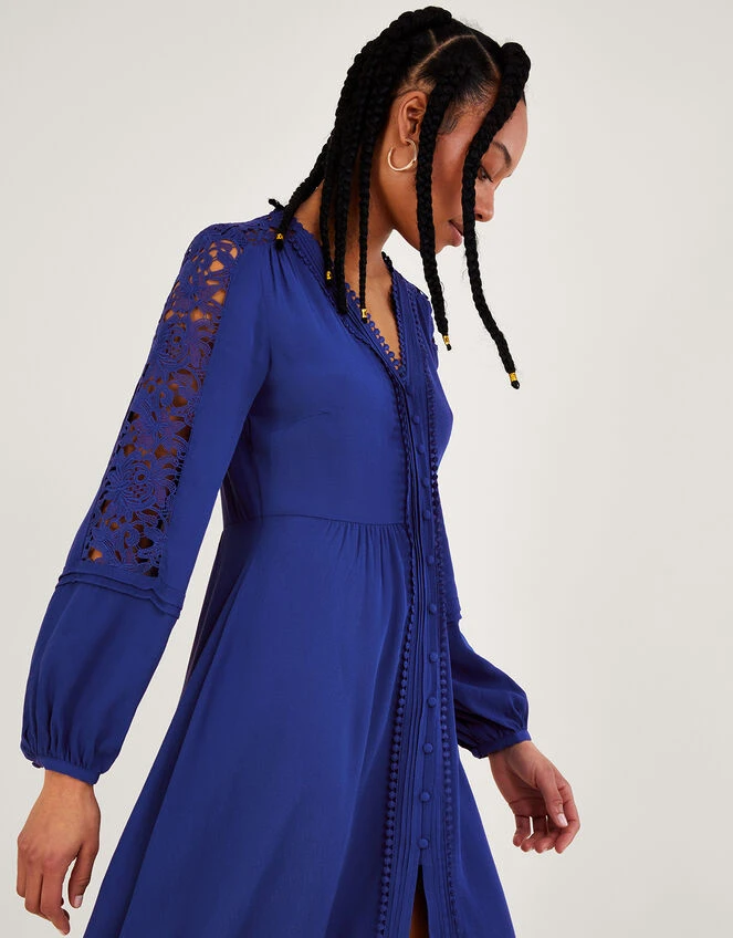 Turning heads in vibrant cobalt, Hope is the perfect dinner date piece. She features delicate lace detailing to the sleeves, with a fabric coated button through fastening and embroidered trims that run from the neckline down to the hem. Cinching in at the waist, she falls into a just-below-the-knee skirt that’s sure to flow as you take to the high street.