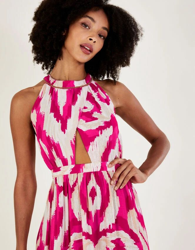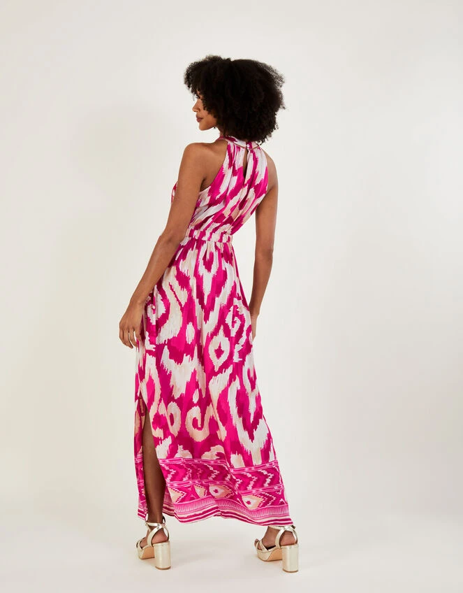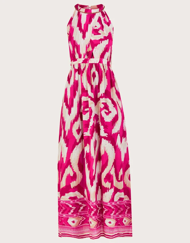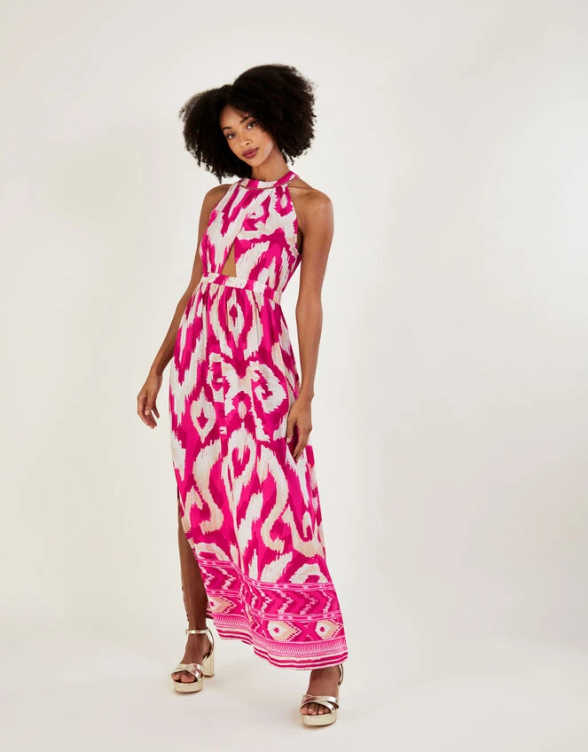 Reminiscing of dining under the sunset, this piece will make you want to escape the winter chills (we don’t blame you!). Still wonderfully suitable for any special event, this dress combines a cut-out, crossover bodice with a swishy maxi that’s finished with side slits. Cinched at the waist, it’s flattering on all shapes and sizes, with an embellished high neck and ikat print to finish.