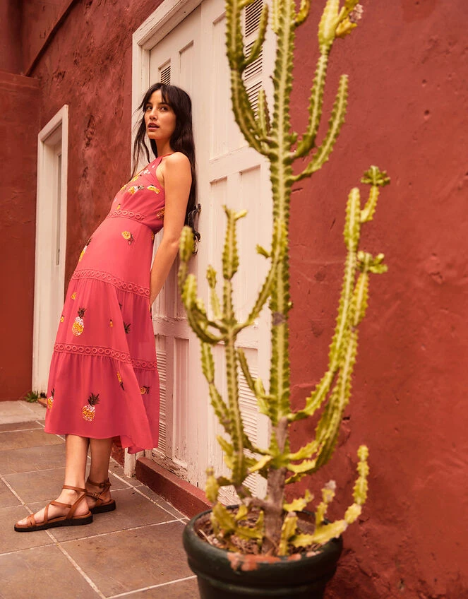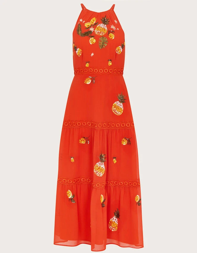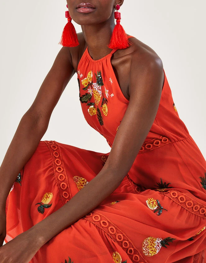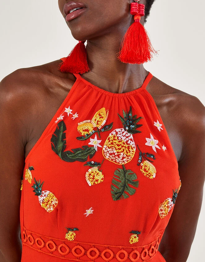 Infused with sweet pineapple embellishments, Isabel is giving us nothing but summer. She’s splashed in a refreshing tangerine, with a feminine halter neck bodice, with mod-style, o-ring detailing that tiers from the waist to the hem. The gauzy overlay adds a floaty feel, perfect for catching the warm breeze as you mingle round the event.