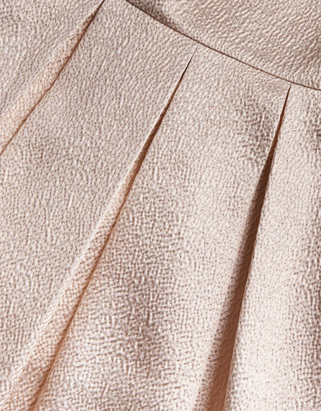 Building up the courage to join their friends on the dancefloor? They’ll feel more confident than ever when they’re styling this dress to the party. Designed in structured jacquard fabric, the textured gold finish will look beautiful underneath the disco ball, with box pleats that’ll ensure the skirt twirls beautifully. The asymmetric profile brings a unique focus point to the dress, ensuring it stands out amongst their wardrobe of wonders. Fastens on the side with a zip. Gold