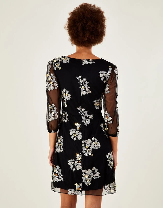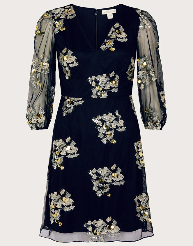 With a sequin embellished mesh overlay, this dress features a fun fit and flare skirt ready for twirling round the dancefloor. The underlay adds depth, whilst the mesh sleeves add a delicate touch.