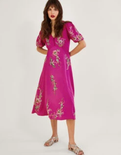Dressed in florals and sprinkled with sequins, our Jenny dress is ideal for afternoons enjoying tea and scones (and maybe some fizz). The dobby fabrication is light and airy, moving freely through the skirt whilst the waist sits close to the body thanks to the elasticated panel on the back. Finished with puff sleeves and button detailing through the bust, style it with block heels for comfort.
