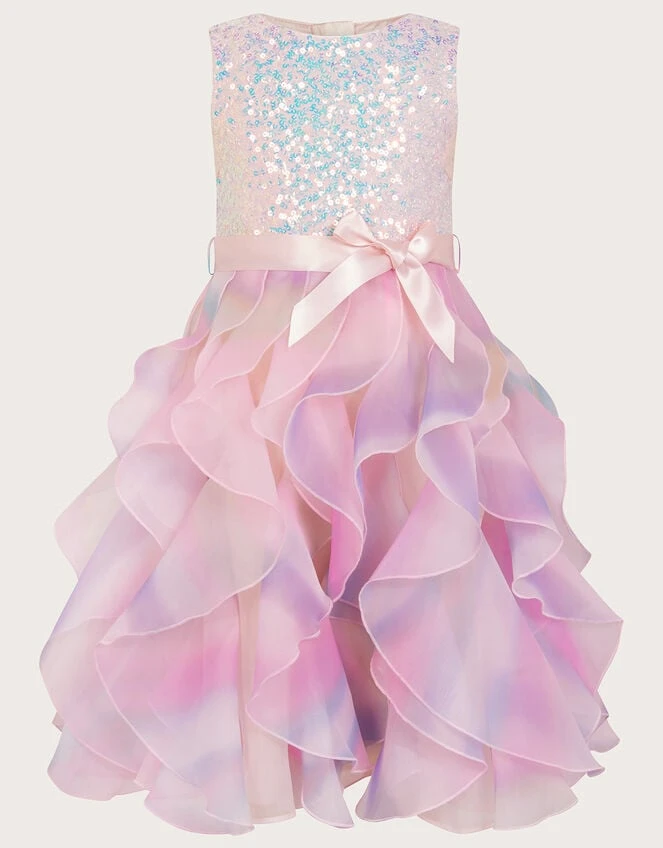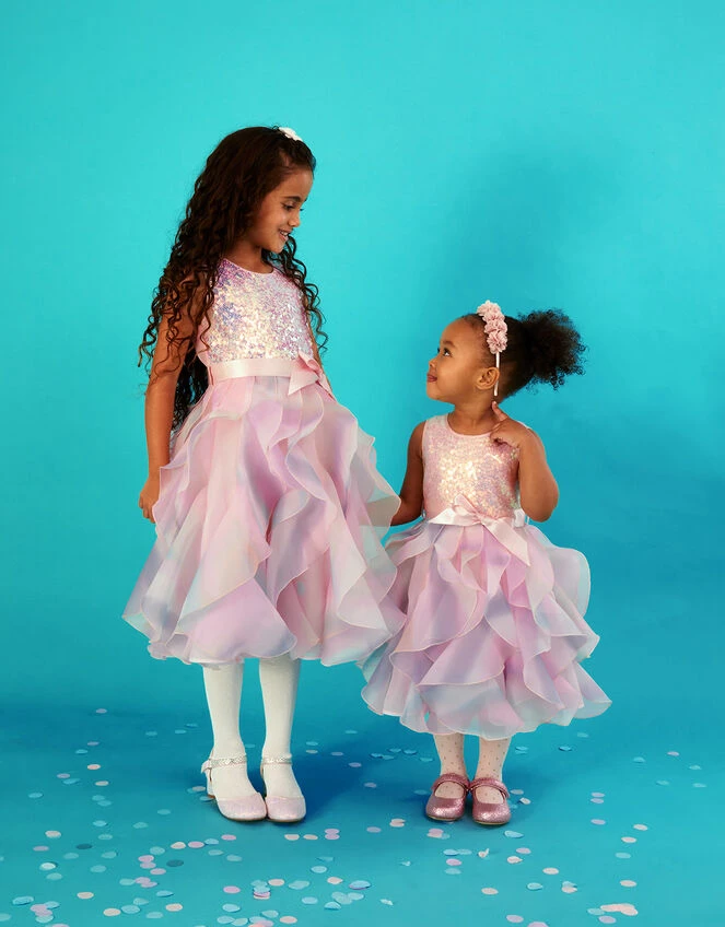 Let them live their mermaid dreams with Jojo, finished in a pretty-in-pink marble print. The bodice boasts lashings of sequins, whilst the skirt is designed with bouncy ruffles that’ll swish and sway as they take on the dancefloor. Finished with a sleek satin bow to the waist for a snug fit. Multi