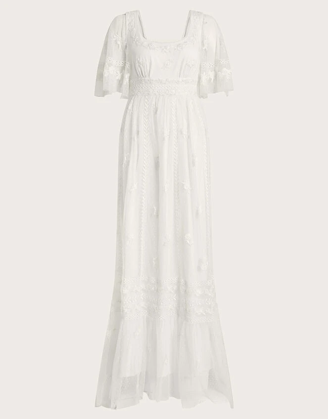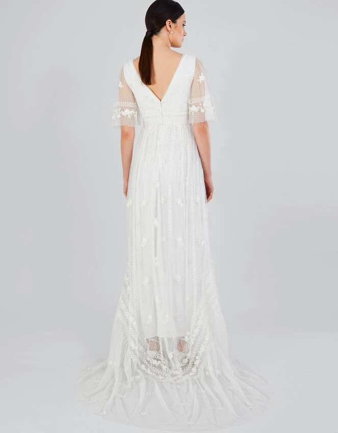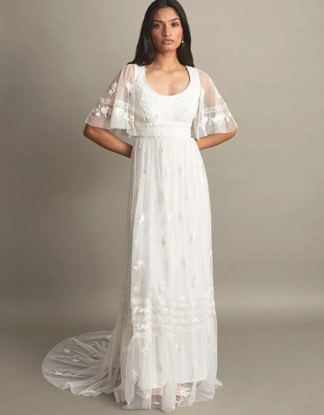 Introducing our Julita bridal dress, a bohemian style that supports free movement through the early afternoon ceremony to the ongoing hours of the reception. Effortlessly light and breathable, it’s built with a scoop neckline, angel sleeves and a generously floaty skirt. Overlaid with netting, you’ll find a spotted pattern in the background that’s interrupted with accents of embroidered florals over the sleeves, bodice and skirt, complete with tape lace for definition. Turn it to its back to find a v-shaped dip, concealed zip fastening and most importantly, an intricate train that’ll softly sweep the floor.
