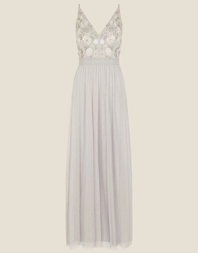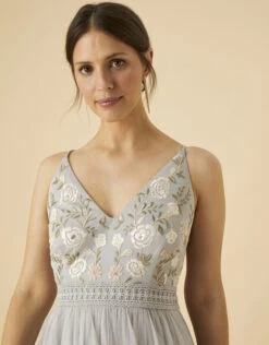 Kathy’s florals are like those out of a fairytale, with hints of sage green and pale pinks. Look closely and you’ll see the intricate details on her waistline, drawing all attention to the cinched silhouette. Style with nude heels that’ll poke out just under the swishy maxi skirt.