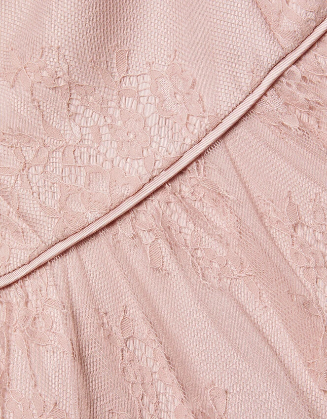 Covered in dusky pink lace, this special dress is made for occasions. The regal silhouette is built with a sweetheart Bardot neckline, slim bodice and floaty hemline that dips slightly at the back. Finished with a glossy bow and zip on the reverse. Pink