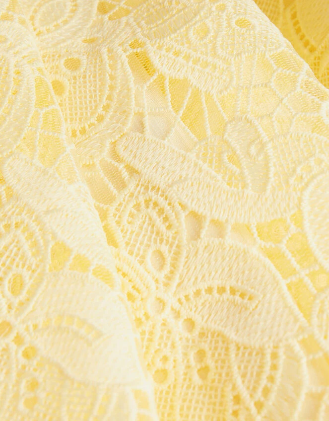 Designed in the sunniest of yellow hues, this sweet dress is cast in a refreshing lemon backdrop, brightening up any occasion. The all over lace finish adds a pretty touch, with an asymmetrical ruffle neckline for a contemporary look. Yellow