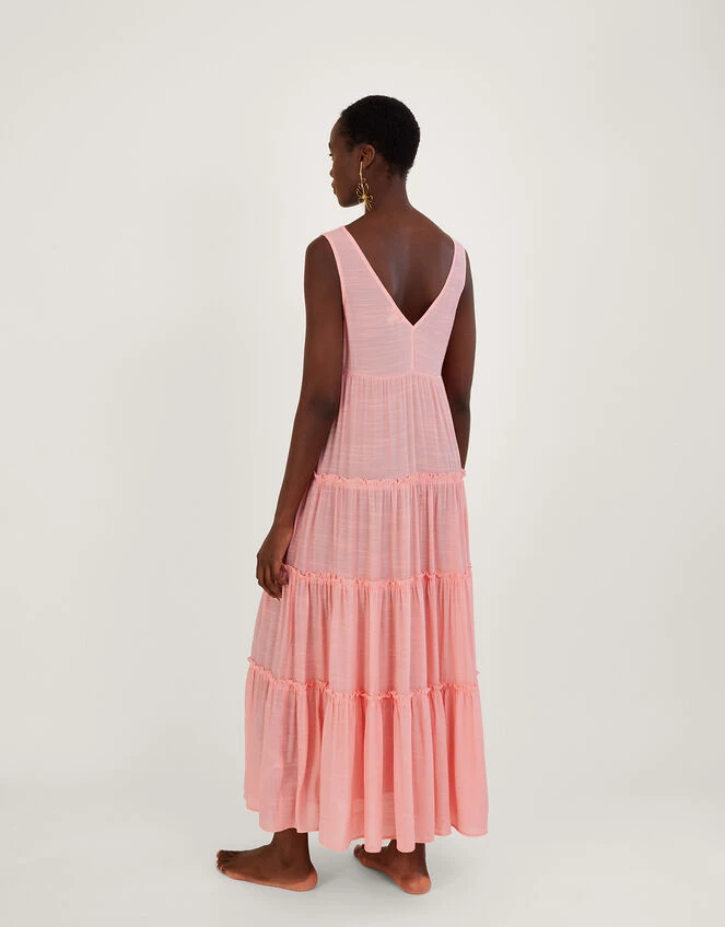 Opt for something as breathable as it is beautiful for your evenings beside the sea. Splashed in a peachy pink hue, it features lace through the bodice and a tiered fall, perfecting the bohemian finish. Designed in an airy LENZINGβ’ ECOVEROβ’ blend, it’s slightly sheer – ideal to style over your swimsuit for spontaneous dips in the sea.