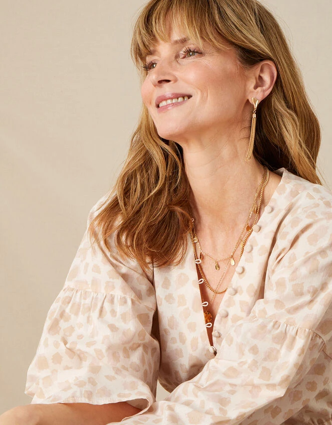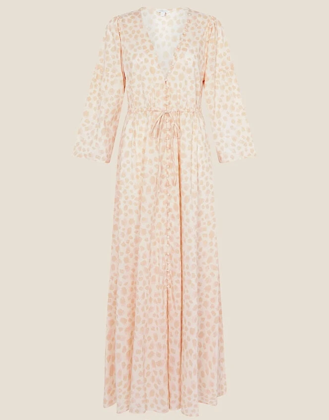 A peachy leopard print falls through Leni’s maxi length. Lightweight and breathable, she’s designed to keep you cool in the summer heat with a loose fit and button front. Cinch the waist with the self-tie to bring some shape to her profile. Natural