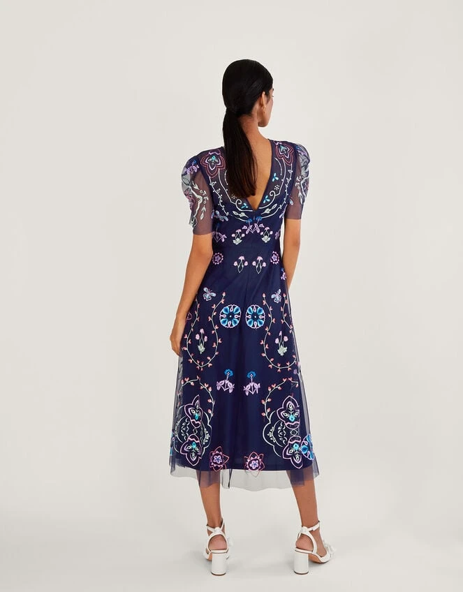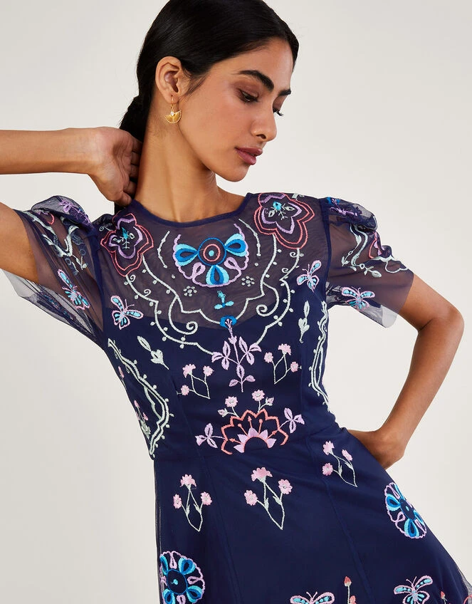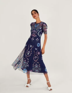 A wardrobe winner for evenings: Leor’s vibrant embroidery and swishy mesh overlay creates a conversational design. The short sleeves stay unlined for an airy touch, whilst the silhouette forms a fit-and-flare cut that’ll gently swish on the dancefloor at the end of the night. Style alongside strappy heels and a cropped jacket to complete the look.