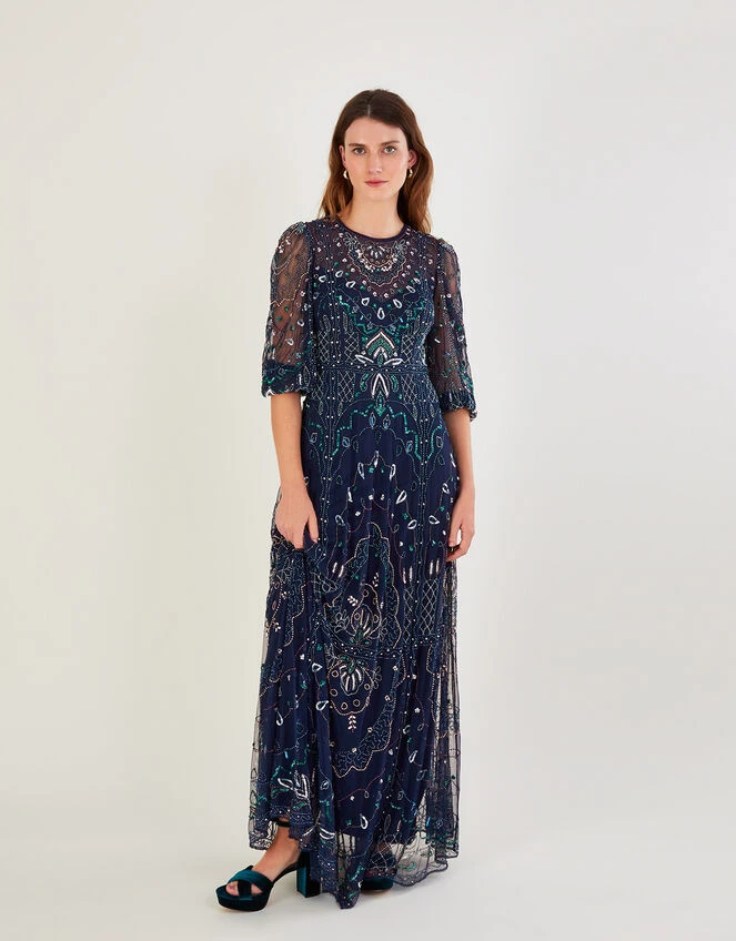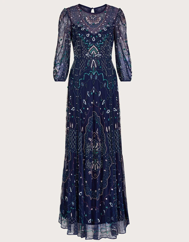 Mirroring the beauty and complexity of the ocean, Lily’s blue palette and beaded design ensures she’s seen at crowded events. Sitting slim through the bodice, she falls into a floaty maxi skirt with elbow length sleeves and a keyhole button to finish. Just watch the embellishments gracefully move atop the mesh overlay, styling perfectly with a delicate, lightweight jacket.