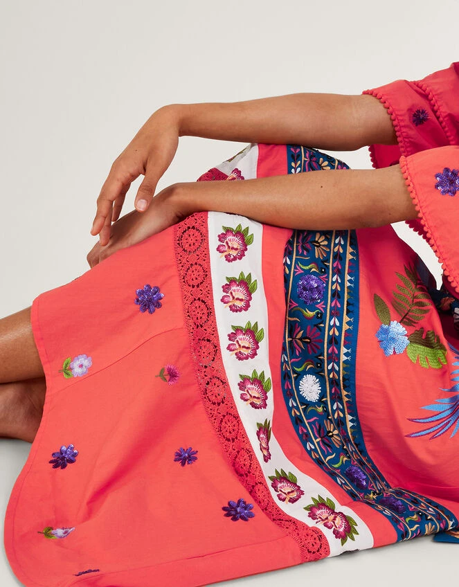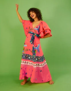 Ready for a fiesta? Our Lucy dress is designed with statement layered sleeves and embroidered trims for movement as you dance the night away. Splashed with a tangerine backdrop, Lucy’s wrap style bodice is embroidered with macaws in flight and sparkling florals. Cinching in at the waist with a contrast tie belt, she falls into a slightly dipped hemline, allowing your pedicure to peep through.