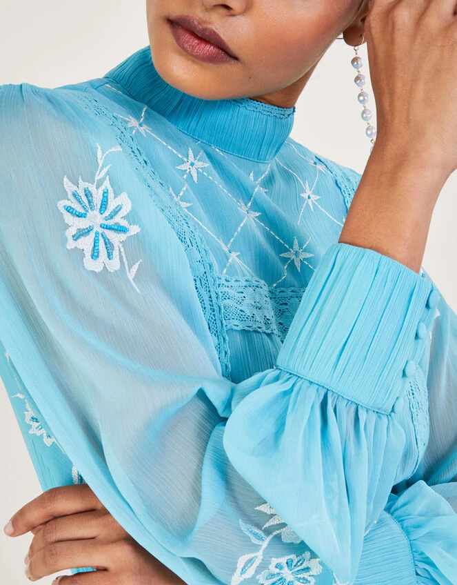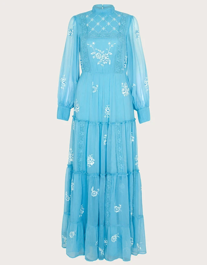 Maddie was born to mesmerise; The perfect choice for dinner parties, whether you’re a guest or host. Doused in floaty blue fabric, the white floral embroidery is found throughout the tiered skirt and blouson sleeves, with a contrast design that accentuates the high neckline. Finished with lace inserts and ruching, it fastens on the reverse with a keyhole button.