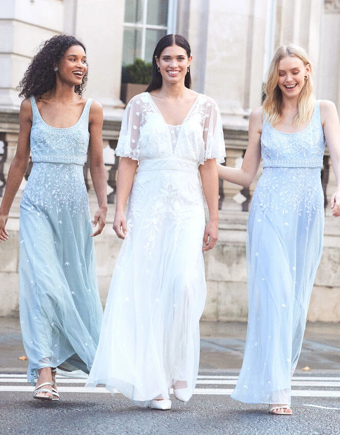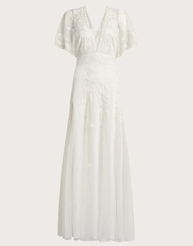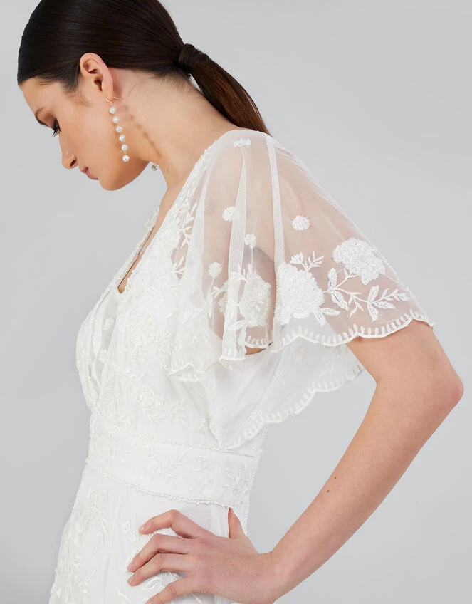 Introducing Maggie, the perfect creation for the more relaxed bride. Designed with bohemian styling in mind, the flowing profile starts at the top with scallop caped sleeves that drape effortlessly over the shoulder, supporting movement for deep embraces and plenty of dancing at the reception. The maxi skirt is crafted with a mesh overlay, boasting floral embroidery that falls gently from the bodice, catching the breeze as the bride takes to the aisle. Turn to its back to find the v-shaped dip, and a fabric coated button fastening for a detailed finish.